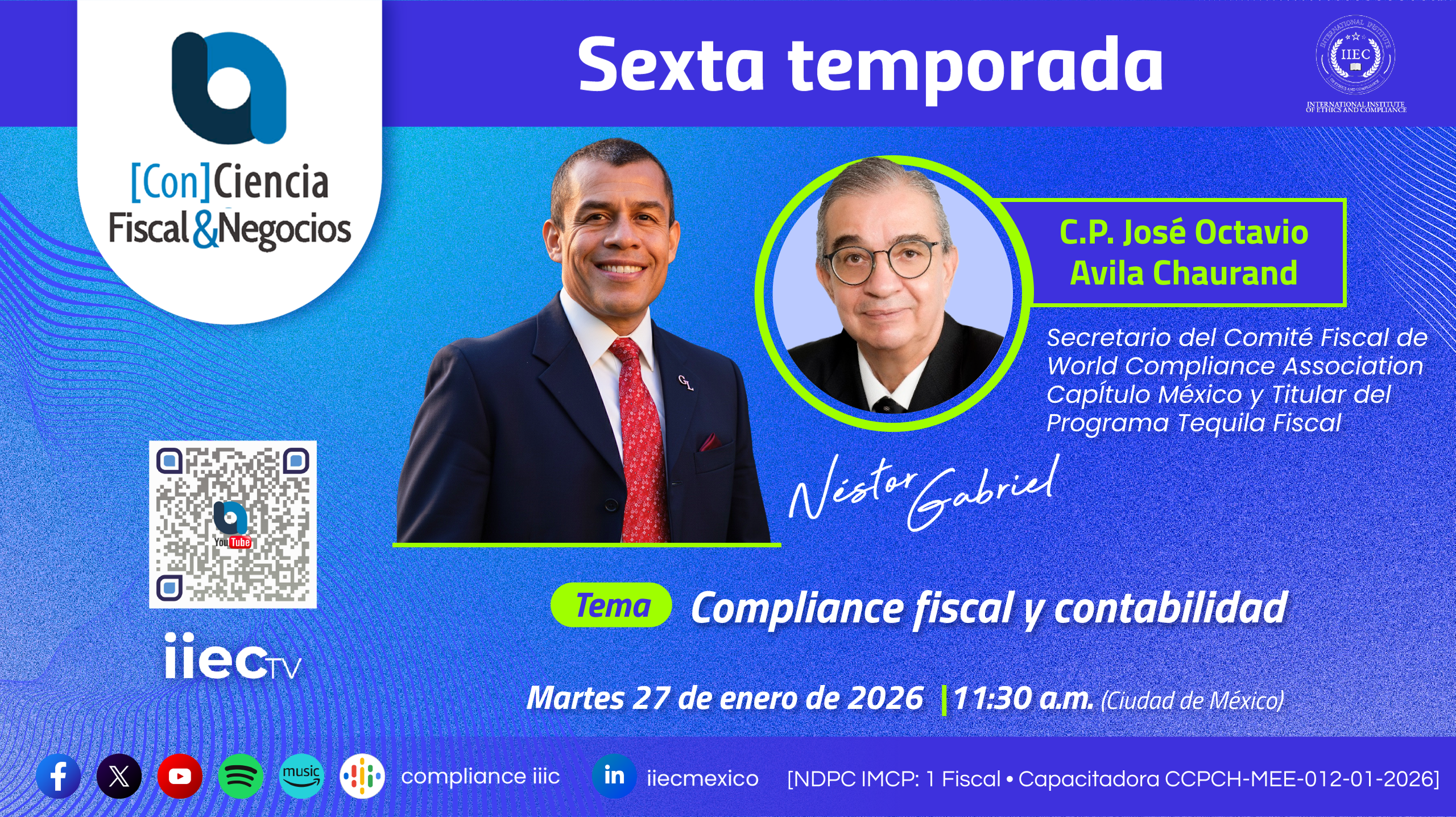 El compliance fiscal y la contabilidad Frente a las importantes reformas al Código Fiscal de la Federación (CFF) y a otras leyes tributarias para 2026, la contabilidad se posiciona como la principal fuente de evidencia para demostrar la realidad económica de las operaciones pasadas y presentes de los particulares. Estas reformas señalan un reforzamiento en las facultades de fiscalización como son: nuevas obligaciones de retención de ISR e IVA para operaciones digitales, acceso en tiempo real del SAT a las bases digitales de las plataformas, y cambios en la facturación electrónica. Entérate. Nuevo Programa por IIECtv [Con]Ciencia Fiscal&Negocios® 🇲🇽 6ta. Temporada Con la participación del C.P. José Octavio Avila Chaurand Secretario del Comité Fiscal de World Compliance Association Capitulo México y Titular del Programa Tequila Fiscal Fecha y hora Martes, 27 de enero de 2026, 11:30 hrs. CDMX Enlaces de interés • Promocional: https://youtu.be/-9CHfLmU-o8 • Vive el programa en: Pendiente • Canal de WhatsApp: https://whatsapp.com/channel/0029VaA5… Formulario puntos válidos para NDPC del IMCP. Capacitadora CCPCH-MEE-012-01-2026: https://forms.gle/LqDcgbK74ETJXTfA9 «Por la conciencia de ser empresarios y profesionales informados y formados en la cultura cumplimiento». [Con]Ciencia Fiscal&Negocios® es un espacio gratuito de comunicación bidireccional activa y de debate alternativo, donde se estimula y permite la participación de toda la sociedad, estructura y evolución en materia fiscal y contable para los negocios con integridad, auspiciado por el Instituto Internacional de Ética Empresarial y Cumplimiento [@iiecompliance]. ℹ️ Apoya nuestro contenido: 👍 Like ✍️ Suscribir 📰 Activar notificaciones 🗣 Comentar 🔀 Compartir Tu apoyo ayudará a mejorar la visibilidad de [Con]Ciencia Fiscal & Negocios® en los motores de búsqueda. ¡Gracias por tu colaboración! Síguenos en vivo en: YouTube: https://www.youtube.com/@nestorgabrie… Facebook live: https://www.facebook.com/consultorese… Linked In: https://www.linkedin.com/in/n%C3%A9st… 11:30 • 🇲🇽🇨🇷 Ciudad de México – San José 12:30 • 🇨🇴🇵🇪🇺🇸 Bogotá – Lima – Chicago 14:30 • 🇵🇾🇦🇷🇧🇷 🇨🇱 Asunción – Buenos Aires – São Paulo – Santiago *Patrocinadores*: CPA Vision • tecnología aplicada a los impuestos – AgentePro • Profesionalizando la gestión de seguros. #IIEComplianceOfficer #IIEClub #Compliance #IIEContaduría #IIECFiscal #Anticorrupción #Integridad #Fiscal #Negocios #BuenasPrácticasCorporativas Síguenos en redes sociales: @gabrielnestor • @ceiconsultor • @CpaVisionMx • @IIECompliance • @agentepromx